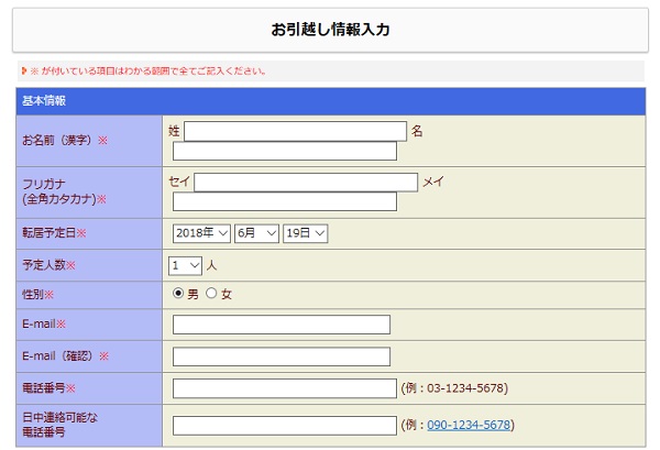 引っ越し予定日や人数も選択しますが、性別を選ぶ欄もあります。連絡先は、メールアドレスだけではなく、電話番号も必須項目です。