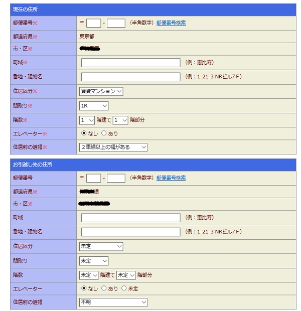 新旧の住所を記入していきますが、どちらも番地の記入は任意で、現住所は町域まで、引っ越し先は、市町村までの入力でOKです。引っ越し先がまだ、はっきり決まっていない場合でも、見積もりを調べることができます。