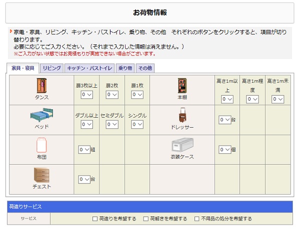 荷物の詳細や荷作りサービス、不用品の処分などを選択します。